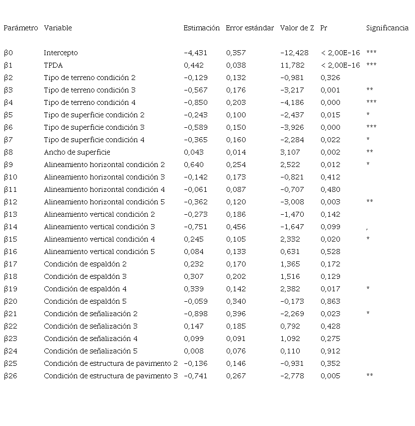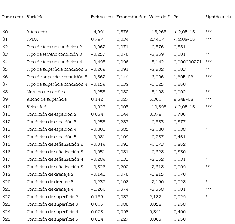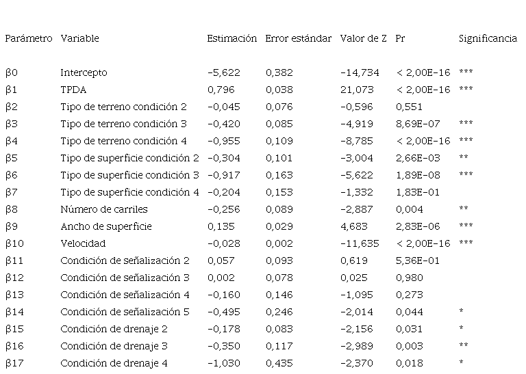 Los valores de salida del software empleado indican el nombre de la variable, la estimación de esta, el error estándar, el valor del estadístico Z, la probabilidad y la significancia. El signo del valor en la columna de estimación indica si la variable tiene una afectación negativa o positiva en la ocurrencia de choques viales. De esta forma, si la estimación corresponde a un valor negativo, un cambio positivo de una unidad en la variable representa una disminución en la ocurrencia de choques predicha por el modelo.