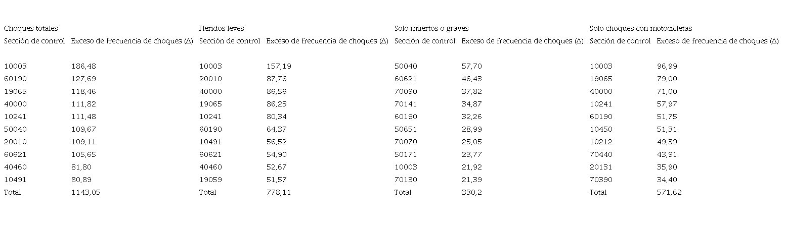 El conjunto de las diez secciones de control con mayor cantidad de exceso de choques totales presenta un exceso de 1143 accidentes de tránsito totales. De manera similar, se identifica en diez secciones de control un exceso de 778 colisiones con heridos leves, 330 colisiones con heridos graves o fallecidos y un exceso de 572 colisiones con motociclistas involucrados (ver CUADRO VIII).