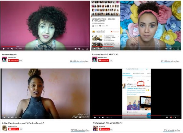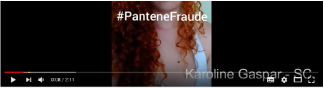 Nesse sentido, inclusive, um vídeo foi emblemático: além de mobilizar a atenção de mais de cento e vinte e cinco mil fruidores - marca que ultrapassou alguns audiovisuais institucionais da própria ação -, apresenta dezesseis garotas de diferentes estados brasileiros denunciando a fraude a partir da enunciação de um texto previamente elaborado – “eu sou fulana, de tal estado, uma das quarenta mil mulheres enganadas pela Pantene. #PanteneFraude”, além de indicar essa hashtag ao final de cada mensagem para servir de conexão para os desdobramentos das discussões em torno da ação da marca, no Twitter.