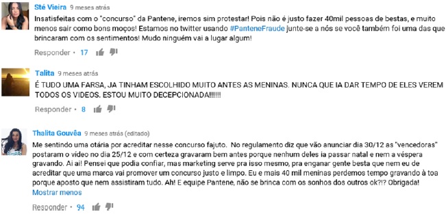 Nos vídeos dissonantes do discurso oficial produzidos pela audiência, os principais enfoques foram o relato insatisfeito em relação à falta de transparência do processo seletivo e as demonstrações de datas e postagens correlacionadas que comprovariam que a estratégia foi uma fraude, ou seja, que a marca realizou um simulacro da participação, já que havia pré-selecionado as participantes antes do processo descrito no regulamento. Em vários deles, há o argumento de que esse tipo de prática condenável proporciona a inviabilização de realização sonhos pessoais das consumidoras engajadas, revelando a decepção numa dimensão emocional das envolvidas. Nesse sentido, a estratégia Cabelo Pantene constituiria uma propaganda enganosa – dos pontos de vista estratégico e discursivo, na percepção de grande parte – engajada – da audiência.