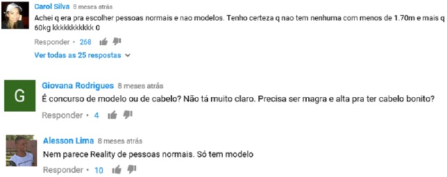 Os comentários negativos postados abaixo dos vídeos da marca também enfocaram os três tópicos mencionados anteriormente: i) desconfiança em relação à “fraude” realizada pela marca, ii) insatisfação diante da incoerência discursiva relacionada à mudança do estereótipo de beleza – deslocamento da celebridade para a consumidora “comum”; e iii) descontentamento em relação à falta de representatividade da diversidade étnica presente no Brasil.