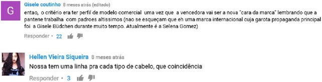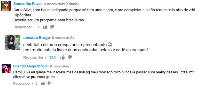 E outros tantos comentários rebatem a tentativa da marca em apresentar a diversidade étnica da brasileira por meio das participantes selecionadas. Um argumento recorrente é a pseudorrepresentação das afrodescendentes no elenco – e seus naturais tipos de cabelo. Uma internauta também chama a atenção para visuais que fogem aos padrões estéticos que incluem cabelos e tons de coloração mais tradicionais.