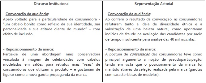 Diante do que foi exposto, é possível construirmos uma tabela-resumo com as principais incompatibilidades verificadas entre o discurso institucional e a posterior representação actorial das consumidoras do reality show “Cabelo Pantene”: