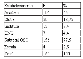 Uma vez estabelecido o perfil dos respondentes, uma pergunta buscou confirmar se eles efetivamentepraticavam judô em OSCs. Dos cento e sessenta respondentes, 97,5% praticavam em organizações com esse perfil,incluindo academias, clubes, institutos ou ONGs. Apenas 2,5% praticavam em organizações com fins lucrativos, sendo todas escolas. A Tabela 5 detalha o resultado.