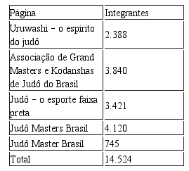 Trata-se de uma pesquisa de corte transversal, com os dados coletados em uma semana do primeiro trimestre de 2017. O questionário foi pré-testado com dez praticantes de judô e, uma vez validado, foi inserido em uma ferramenta de pesquisa on line, o SurveyMonkey. O link para responder ao questionário foi compartilhado em páginas do Facebook voltadas aos praticantes do judô, como Uruwashi – o espírito do judô, Associação de Grand Masters & Kodanshas de Judô do Brasil, Judô– o esporte faixa preta, Judô Masters Brasil, Judô Master Brasil. A Tabela 1 apresenta o número de integrantes existentes em cada comunidade, no primeiro dia da semana em que o questionário foi aplicado. O total de integrantes dessas fanpages é de quatorze mil, quinhentos e vinte e quatro judocas.