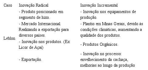 Atenta ao mercado, a cachaçaria Leblon percebeu algumas mudanças e o surgimento de novas possibilidades de sabores para a fabricação de licores, que são produtos que partem da base do destilado de cana-de-açúcar. Tem-se, então, uma inovação radical de produto, que se fundamenta na exploração de frutas regionais brasileiras, como o açaí, que tem tido reconhecimento e demanda no mercado internacional.