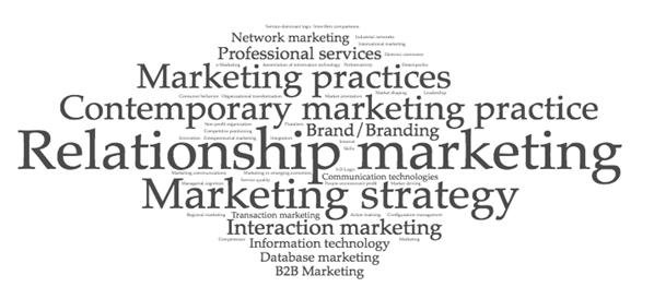 Figure 5 shows the tag cloud of the most frequent words in published research, using the Word Clouds software. The selected bibliographic works contain 113 keywords, and those unrelated to CMP were dropped. We grouped keywords that had similar meaning (for instance, brand and branding, marketing practices and marketing practices, and so forth). The most frequently cited words are: relationship marketing (11.5% of the papers), marketing strategy (8,8 %), contemporary marketing practices (7.1%), marketing practices (7.1%), and interaction marketing (4.4%). In contrast, the less cited words (but which were considered useful CMP descriptors) are: brand / branding, professional services, B2B marketing, database marketing, information technology, network marketing, communication technologies and transaction marketing. Hence, as Zipf's Law suggests, we find evidence of relationships between the frequency of the word and its relative position in terms of citations in CMP research, which leads us to the conclusion that there are some words that are frequently used, and several others that are seldom used.
