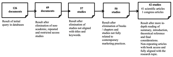 Following Creswell and Creswell’s (2017) recommendation, we performed a documentary survey of extant CMP research from January to February, 2017. We selected studies containing the descriptors (keywords, singular or plural), that contained "contemporary marketing practice" and "contemporary marketing strategy". We then searched the EBSCO, SCOPUS, Spell / Anpad and Google Scholar databases and selected the Applied Social Sciences and Marketing fields. Our requirement was that articles should be published in a journal, with a document available in full text format that could be retrieved.