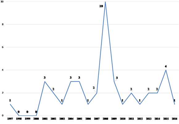 Figure 2 shows the evolution of the published CMP research as of 2016. The first article was published by Coviello, Brodie and Munro (1997). With respect to the number of published studies, ten articles were published in 2008, and four articles were published in 2015. In 2001, 2004, 2005 and 2009, there were three articles published each year; in 2002, 2007, 2011, 2013 and 2014, only two articles per year were published. Accordingly, the annual average of international scientific CMP production is 2.1 articles per year. We thus conclude that international scientific production remains relatively stable since 2001; on the other hand, the production is scarce, which translates to the need to expand this stream of research.