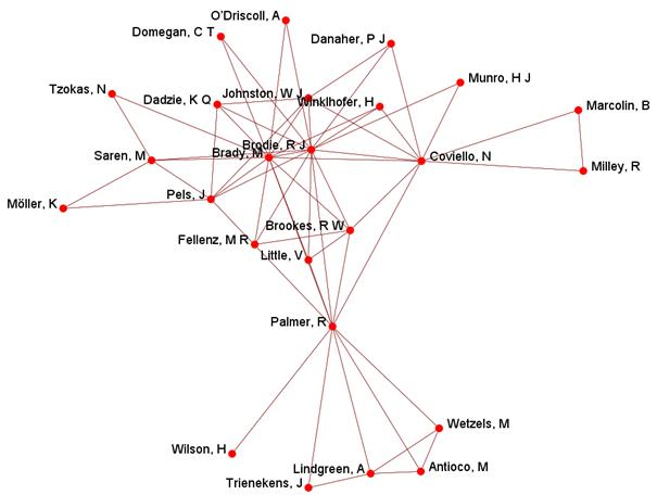 Figure 4 provides a detailed description of the main CMP research network, encompassing the largest number of researchers (27 members) and the largest number of CMP research published in this period (21 articles). This includes Brady, Brodie, Palmer and Coviello, the pioneering researchers from the Contemporary Marketing Practices group from the Auckland University in New Zealand.