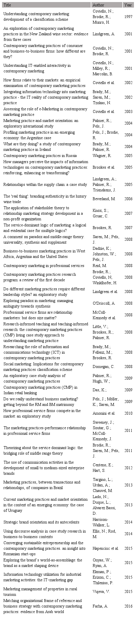 Ten years after the publication of the seminal work of Coviello, Brodie and Munro (1997), this survey searched the Business Source Complete (EBSCO), SCOPUS / Elsevier, Spell / Anpad and Google Scholar databases and found one single CMP paper from Brodie, Coviello and Winklhofer (2008) of an empirical investigation in 15 different countries. The work broadened the academic knowledge of the strategies used by companies in their relationship with the market, suppliers, customers, employees and other business partners. The authors describe the connections between traditional marketing theories and contemporary practices from an organizational perspective.