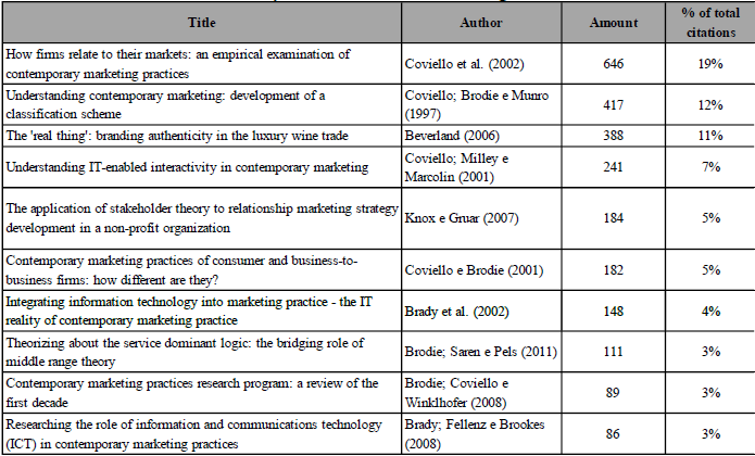 The above-average scientific production accounts for nearly a third of the published articles. 55% of the total citations correspond to five published articles, including: Coviello et al. (2002), with 646 citations; Coviello, Brodie and Munro (1997), with 417; Beverland (2006), with 388; Coviello, Milley and Marcolin (2001), with 241; and Knox and Gruar (2007), with 184 citations.