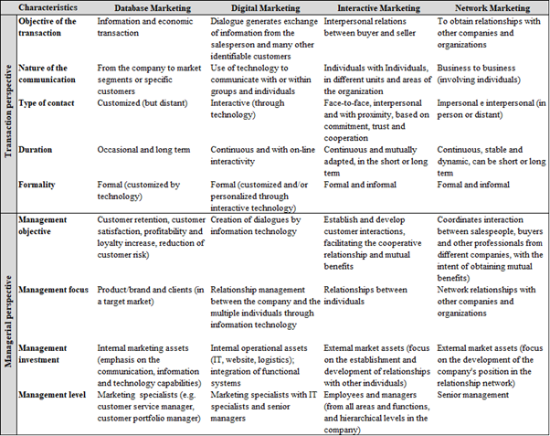 In a subsequent theoretical development, Coviello, Brodie and Munro (1997) and Coviello, Milley and Marcolin (2001) defined a CMP conceptual model that contains five dimensions. The model can be interpreted as a marketing shift from the transactional (i.e. transaction-based) to the relational (relationship-based) perspective. Ekman, Erixon and Thilenius (2015) note that the transaction-based marketing approach still dominates the marketing organizational scenario. Table 1 describes these marketing approaches from a relational perspective.