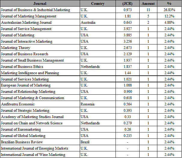 Table 5 presents the main scientific journals that publish CMP studies and their respective impact factors, according to the Journal Citation Reports (JCR). Only three journals published two or more papers: Journal of Business & Industrial Marketing (with 11 articles; UK-based and published by Emerald Insight); Journal of Marketing Management (5 articles; UK-based and published by Taylor & Francis Online); Australasian Marketing Journal (2 articles; Australia, published by Elsevier). According to Bradford’s Law, the core outlets for CMP research is composed of few scientific journals (only three). The remainder of the journals only published one single article each during that period.