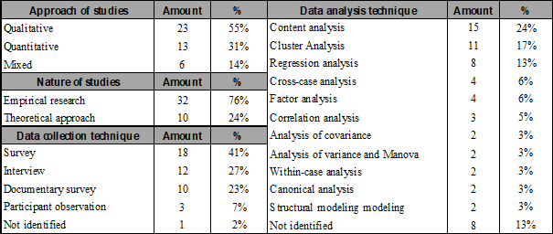 With regards to data collection, 41% of the papers used surveys and questionnaires; 27% of used in-depth interviews; and 23% were document-related. The most used data analysis techniques are: content analysis (24% of the studies), cluster analysis (17%), and linear or multivariate regression analysis (13%). As pointed out by Venâncio, Andrade and Fiates (2014), the quality of the research is impaired when the research does not clearly identify the data collection and analysis techniques chosen.