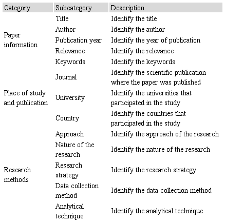 Following that, we conducted a content analysis to produce a thematic categorization in the reading, selection and classification of the data from the bibliographic portfolio. Table 2 depicts the information categories, in line with the conceptual definitions of Sarquis et al. (2016).