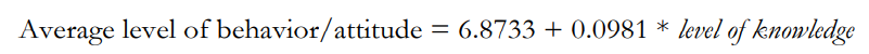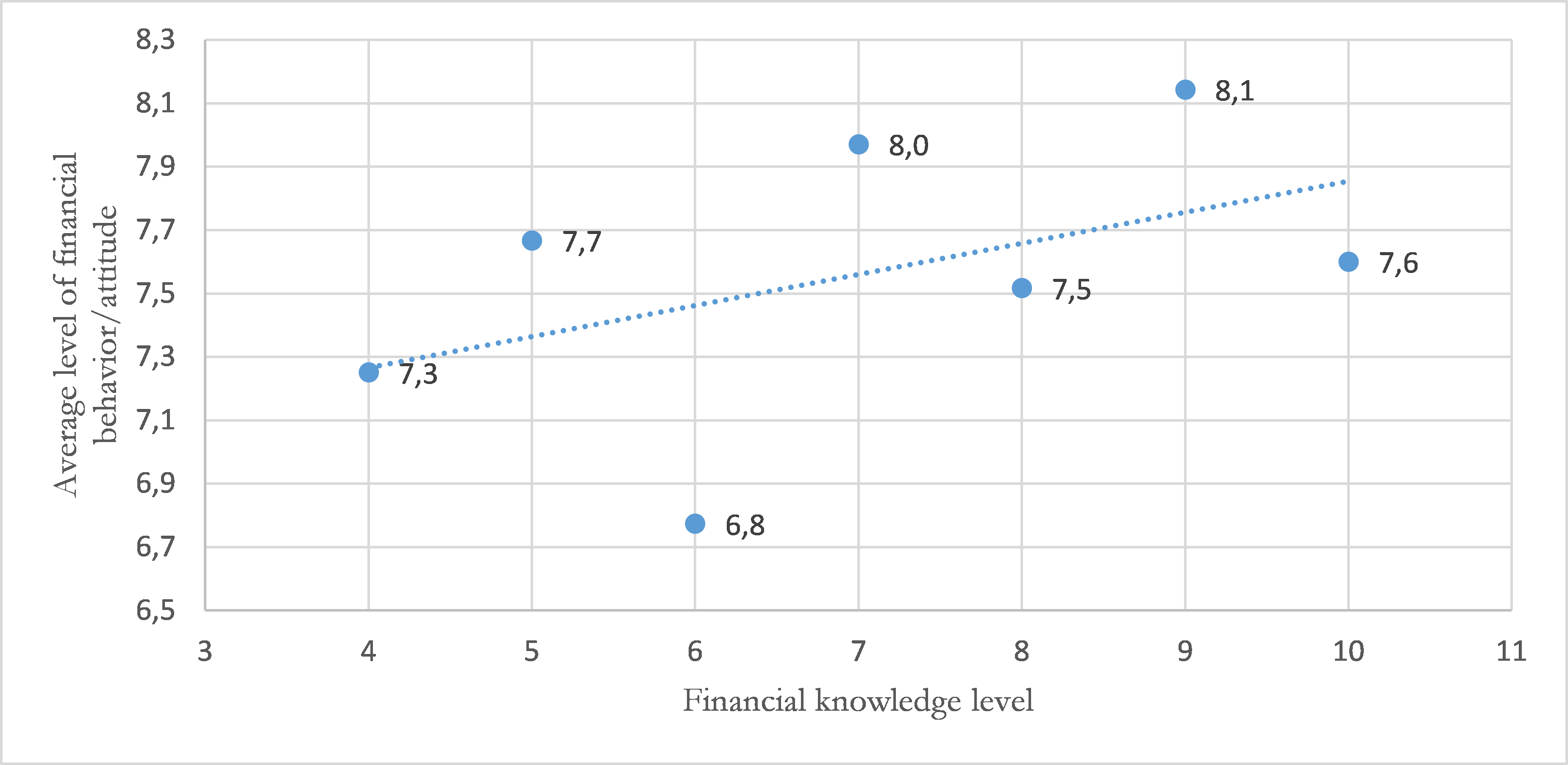 According to Atkinson & Messy (2012), literature often uses financial knowledge as a predictor of positive outcomes, which depend on behaviors that are consistent with individuals' financial well-being. Figure 1 shows that there is a positive relationship between knowledge and behavior/attitude. The financial knowledge score ranged from four to ten while the average behavior/attitude score was between 6.8 and 8.1. While the knowledge score increases by 6 points on the chart, the average behavior/attitude score increases by only 1.3 points. By passing a trend line between the observed points, we obtain the equation 6: