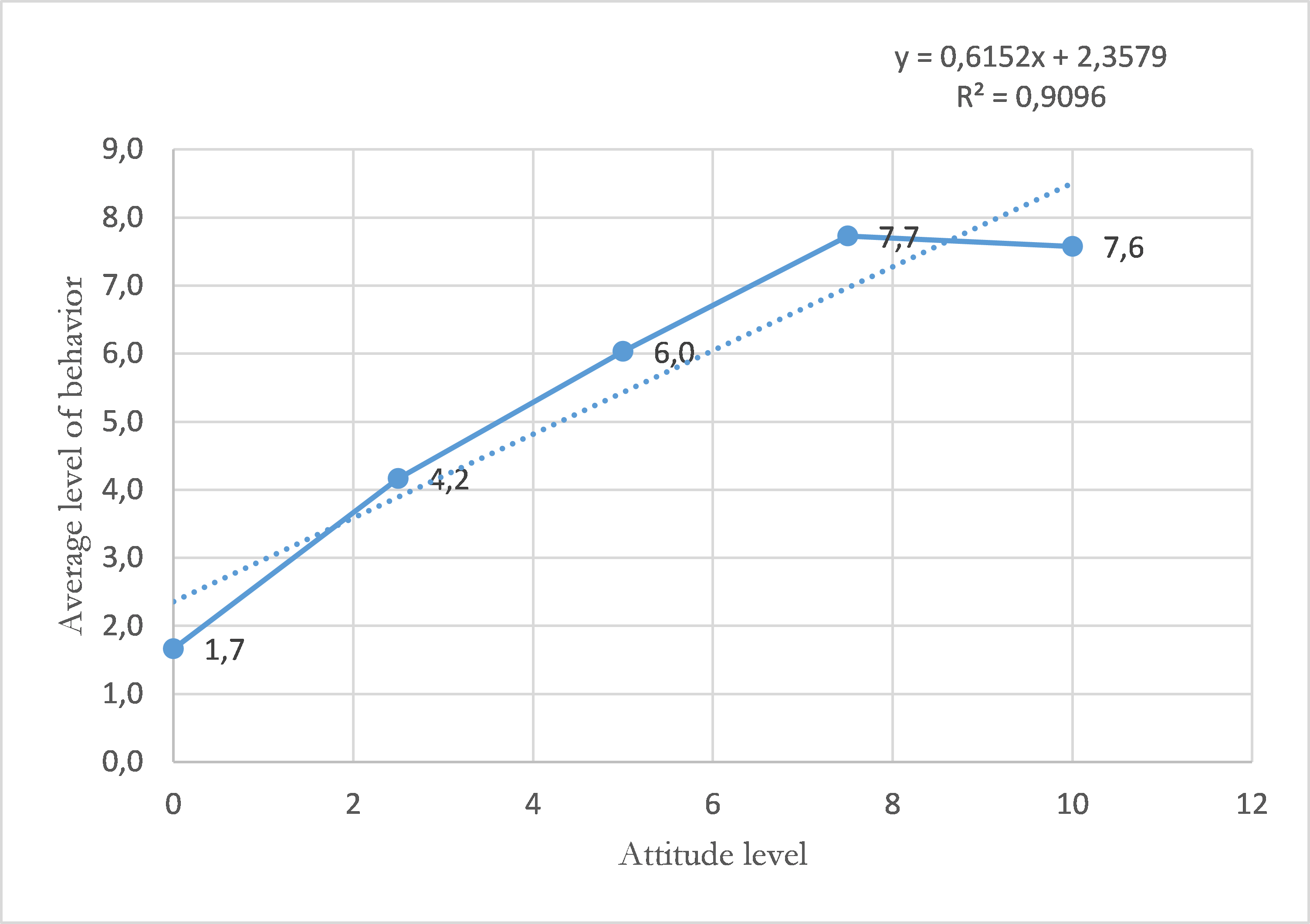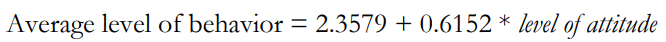 The degree of explanation of the simple linear regression model is R² = 0.9096. Simple linear regression indicates that there is a minimum level of behavior in the individual that is independent of the attitude (2.3579) and each point that is added in attitude level, it positively influences the behavior of the employee in 0.6152 point. These results confirm the idea that employees with attitudes that tend to have long-term gratification have higher behavioral scores.