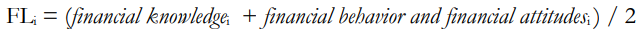 Taking into account the fact that financial literacy, according to the OECD (2013), focuses on the aspects of financial knowledge, financial attitude and financial behavior, the variable financial literacy was measured from the simple average of these aspects, according to equation 1.