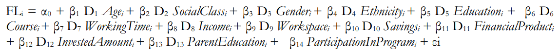 In order to investigate the influence of socioeconomic and demographic variables on financial literacy, a multiple linear regression analysis was performed using the Ordinary Least Squares (OLS) method. The regression aims to analyze the relationship between the financial literacy dependent variable and the independent variables, which are, in this study, participation in program variable and the following binary variables (dummy = Di): age, social class, gender, ethnicity, education, course, working time, income, workspace, savings, financial product, invested amount, and parent education. Thus, to verify if the financial literacy variable is related to the independent variables, the equation 2 was elaborated: