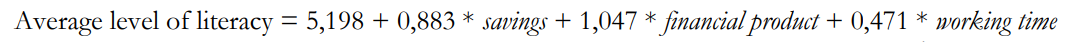 The best model has only three statistically significant independent variables, with R² of 0.467. It means that the variables working time, savings and financial product account for 46.7% of the variations in employees' financial literacy levels. The p-value of the ANOVA test is 0.00%, being considered the model significant. The data do not have autocorrelation of the residuals, since the DW is 1.758, being between the upper limit of 1.74 (n = 100 and k = 3). There is no multicollinearity among the independent variables, since the VIF is less than five (savings = 2,832; financial product = 3,102; working time = 1,438). There is homogeneity of variances, since the p-value is higher than the significance level of 0.05: savings (0,143), financial product (0,114), and working time (0,132). These statistics indicate suitability of the model. Equation 3 presents the final regression model.