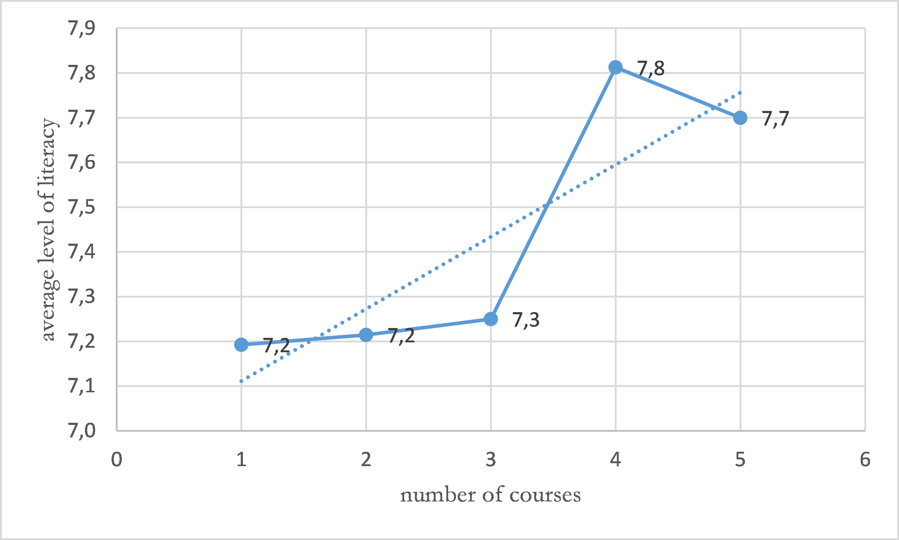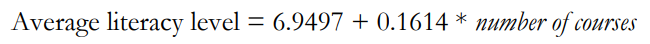 Using the simple linear regression method, we obtained equation 4 which relates the two variables (R² = 0.7343). The intercept of the equation indicates that 6.9497 of the average level of literacy does not depend on the number of courses. For each course the employee participates, his average level of literacy increases by 0.1614. In this way, the maximum variation of five courses provides a maximum increase of 0.81 in financial literacy. This corresponds to an increase of approximately 12% in the average level of literacy.