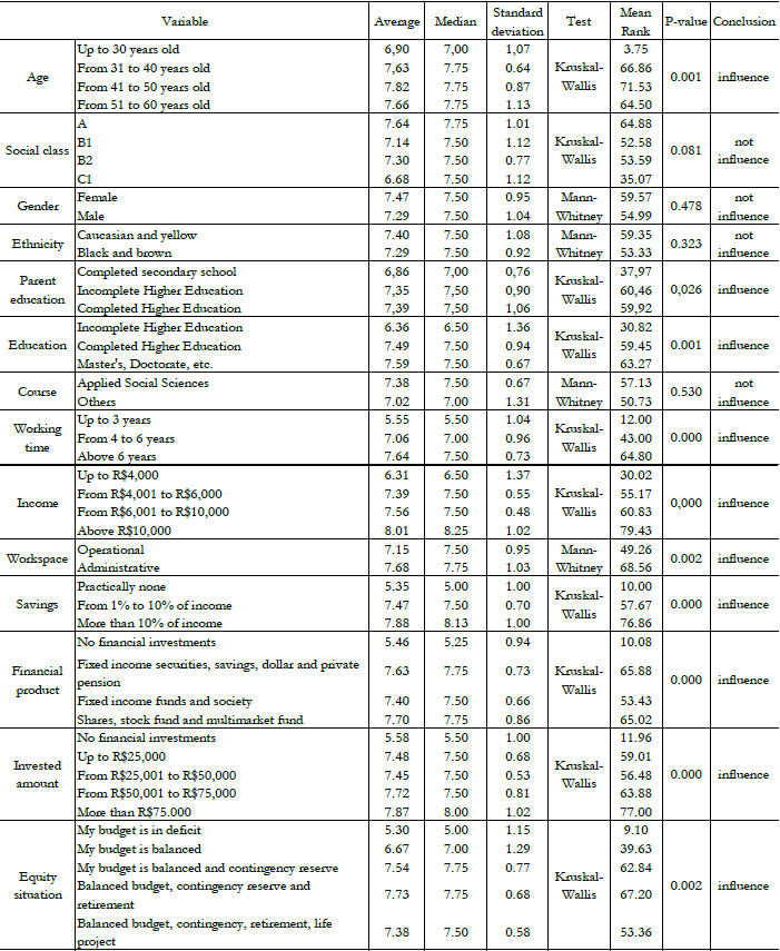 In order to understand if there is a difference in the median of the financial literacy variable, the U Mann-Whitney test (two groups) and Kruskal-Wallis test (more than two groups) were performed considering socioeconomic and demographic variables. Table 3 presents the results that are evaluated in the light of the theoretical reference set forth above.