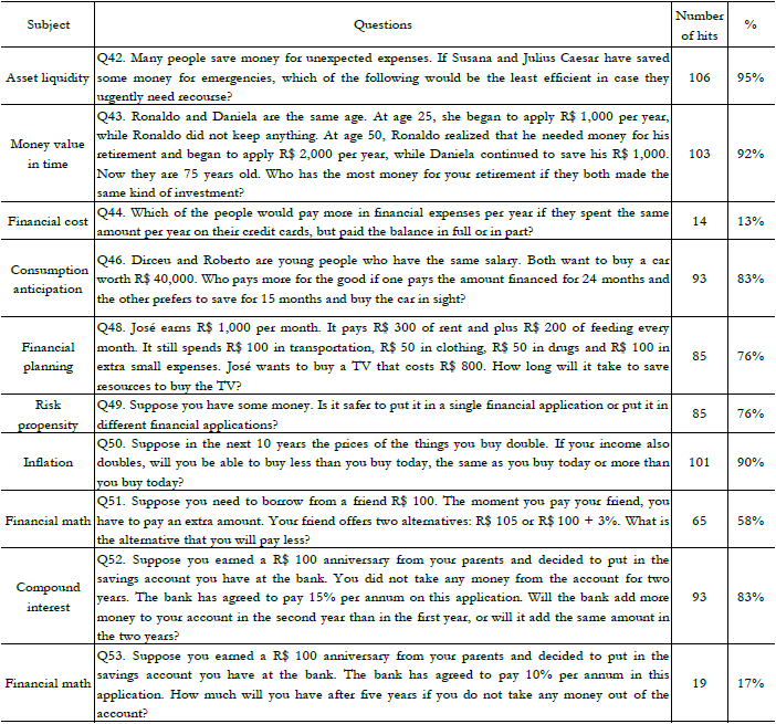 The questions of financial knowledge had the objective of measuring the workers' understanding of aspects such as asset liquidity, value of money in time, financial cost, consumption anticipation, financial planning, risk propensity, inflation, financial math and compound interest. The result is available in table 4.