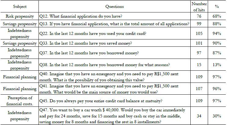 The worst score occurs with the level of financial knowledge. The low level of financial knowledge is not exclusive to this research. According to Potrich et al (2013), in recent years, researchers have been getting very worrying results, given the unsatisfactory level of knowledge, in personal financial management issues (ROOIJ, 2011,MATTA, 2007, LUSARDI & TUFANO, 2015). In this study, of the total number of respondents, only 5 (4.5%) answered correctly all questions of financial knowledge.
