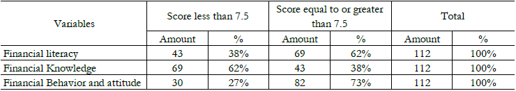 In general, the authors evaluate the following aspects: age, gender, educational level, marital status, income, work, financial education, ethnicity, financial products and equity situation. Table 1 summarizes the association between financial literacy level, financial education level and some socioeconomic and demographic variables.