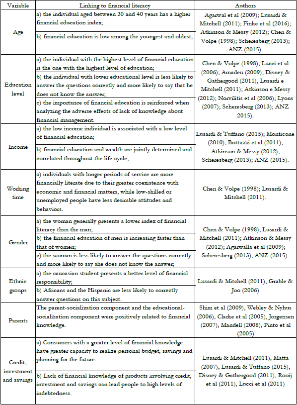 Silva et al. (2017) offer a vision that encompasses not only the level of financial education but also aggregates individual, demographic and socialization characteristics as determinants of the creation of financially conscious individuals. According to the authors, depending on the characteristics of the individuals, the economic and social risks contribute to the worsening of the financial well-being and, consequently, the quality of life.