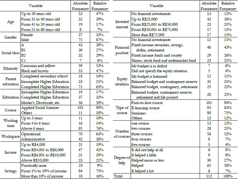 This is a qualitative exploratory research, with survey application, in employees of a private banking institution located in the city of São Paulo. It is a non-probabilistic sample, selected for convenience due to the contact of one of the authors with the banking institution. Data collection took place from April to June 2017, structured through the application of an online questionnaire. As a return strategy, they made contacts by phone, email and message through social networks. In these contacts, the importance of employee collaboration for the development of the work was reinforced, highlighting the guarantee of privacy, and the respondents were not identified at any time, even when the results of the research were divulged. The questionnaire was prepared in accordance with the theoretical framework. In total, there were 121 valid questionnaires. Of this total, nine did not participate in the financial education program offered by the company; therefore, they were removed from the sample. Thus, the sample analyzed in this study is composed of 112 observations.