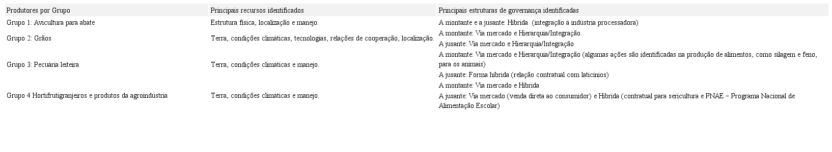 Em especial, no Grupo 1 o valor gerado decorre dos recursos humanos e organizacionais, especialmente do manejo, dado que a apropriação é assegurada pela estrutura de governança de integração à empresa processadora. Com foco nos investimentos e nas práticas realizadas, em termos de eficiência, pauta-se o aumento da quantidade produzida e a qualidade da produção. Já no Grupo 2, a busca por gerar renda tem como predominância a aplicação dos recursos disponíveis com o propósito constante de aumento no volume de produção, visando maior produtividade com os mesmos recursos. As estruturas híbridas e o mercado são predominantes, muito em função de cooperativas locais.