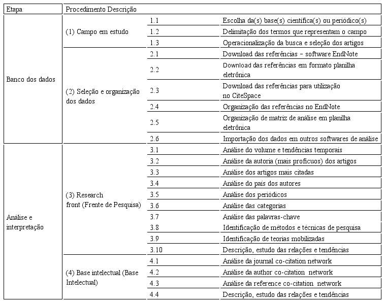 Realizamos o download e organização das referências para diferentes formatos como os softwares EndNote, planilha eletrônica e CiteSpace. Foi organizada a matriz de análise em planilha eletrônica e foi realizada a importação dos dados em outros softwares.
