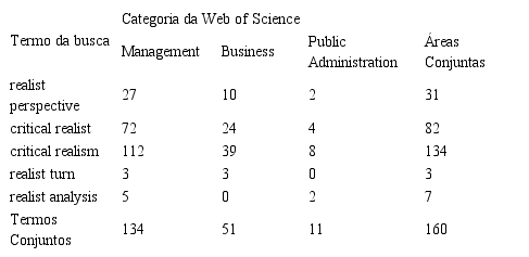 Vale notar que a coluna Áreas Conjuntas não representa a soma em cada linha, uma vez que, um artigo pode ser classificado de forma conjunta nas áreas, por exemplo, em management e business. A linha Termos Conjuntos também não representa a soma das buscas individuais dado que os diversos termos podem identificar o mesmo artigo. Por isso, o sistema de busca organizado destaca as diversas formas de se referir ao “realismo crítico”. Após os filtros, delimitação e desconsiderando os artigos duplicados foram encontrados 160 textos diferentes.