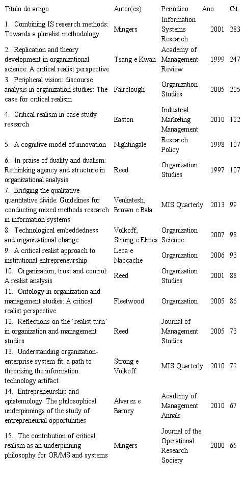 No geral, estes 9 autores (Mingers, Mutch, Tsang, Reed, Easton, Fleetwood, Hodgkinson, Volkoff e Willmott) foram citados 444 vezes e participaram da construção de 48 artigos, portanto, o equivalente à 30,00% do total de artigos da nossa amostra selecionada, relevando que eles possuem uma forte presença no campo. O autor mais profícuo, John Mingers, é autor do artigo mais citado da Frente de Pesquisa: Combining IS research methods: Towards a pluralist methodology de 2001, que foi citado 283 vezes na Web of Science. Além disso, os artigos mais citados de cada um dos nove autores em destaque mostram a amplitude de temas e debates em variadas áreas: sistema de informação, empreendedorismo, tecnologia, debates teóricos amplos sobre ontologia, replicação de teorias, relevância e rigor, e, debates envolvendo perspectivas realistas, socioconstrucionistas e pós-estruturalistas. Na Tabela 2 apresentamos os artigos mais citados da amostra de artigos – citações (Cit.) na Web of Science.