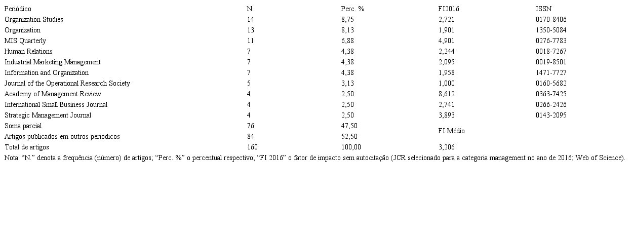 Os 160 artigos mapeados foram publicados em 71 diferentes periódicos. A Tabela 3 apresenta os dez periódicos com maior número de artigos e também destaca o respectivo fator de impacto (JCR). Com destaque, os 10 periódicos mais profícuos publicaram 47,50% do total de artigos, revelando concentração das publicações, em especial, nos periódicos Organization Studies (14 artigos), Organization (13) e MIS Quarterly (11).