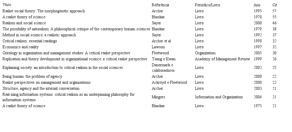 Os periódicos Organization Studies (14 artigos) e Organization (13) são os principais divulgadores da abordagem realista crítica no estudo de organizações e gestão, além do MIS Quarterly (11) que é um periódico especializado em debates sobre tecnologia da informação e sistemas de informações gerenciais. Na Organization Studies foram publicados alguns dos artigos mais citados do campo e já apresentados aqui como Fairclough (2005), Reed (1997, 2001). Nesse periódico foi publicado também o texto de Al-Amoudi e Willmott (2011) que propõe convergências entre o socioconstrucionismo e o realismo crítico.