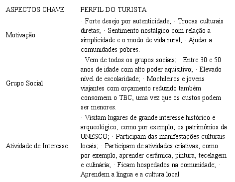 No trabalho de Bursztyn e Bartholo (2012), os autores citam um importante documento elaborado pela SNV- Netherlands Development Organization, em 2009, que apresentou um perfil do turista de Turismo de Base Comunitária da Fundação Casa Grande. Esse perfil é ilustrado no Quadro 1, e fornecem valiosos insights para o planejamento e implantação de melhorias no Turismo Comunitário.