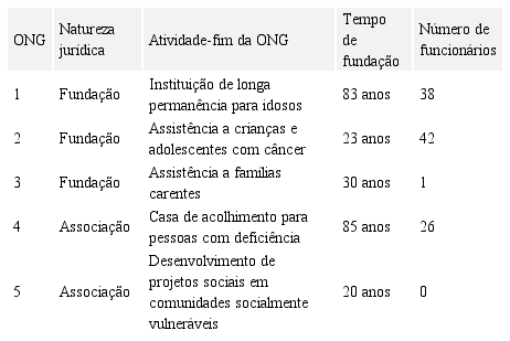As ONGs selecionadas no município de Juiz de Fora contam com expressivo reconhecimento social em função, entre outros aspectos, dos anos de atividade ininterrupta (48,2 anos, em média). Nota-se, pela observação do Quadro 1, que elas se voltam para fragilidades do tecido social local. A terceira fundação (ONG3) e a segunda associação (ONG5) desenvolvem suas ações por meio de voluntários. Seus gestores estimam contar com 600 e 140 colaboradores, respectivamente.