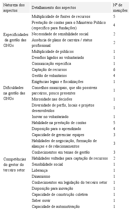 Na etapa de entrevistas com os gestores de ONGs, buscou-se a identificação das especificidades e dificuldades da gestão de organizações públicas não estatais, além das competências de administradores nessa seara. Elementos distintos daquilo que se nota em empresas e organizações públicas foram reconhecidos. Essa constatação reforça a noção de que não bastam adaptações nas práticas do business, mas que devem ser construídos processos específicos para o adequado gerenciamento no terceiro setor. A síntese das respostas encontra-se no Quadro 2.