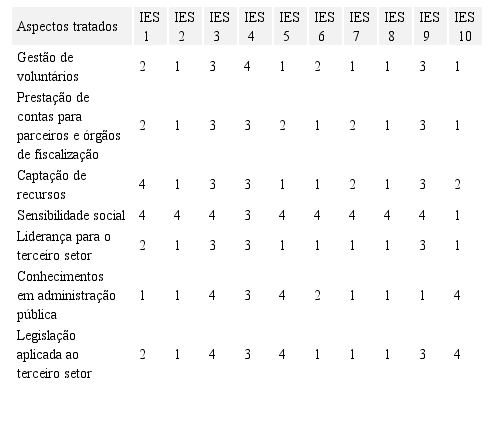 Observa-se que três aspectos que foram frequentemente citados nas entrevistas com os gestores (captação de recursos, gestão de voluntários e prestação de contas para parceiros e instancias de controle) são pouco trabalhados pelas IES. Percebe-se, assim, que o atendimento às demandas das organizações sem fins lucrativos não é a prioridade dos cursos de administração – o que já era esperado, tendo em vista as referências teóricas discutidas neste trabalho.