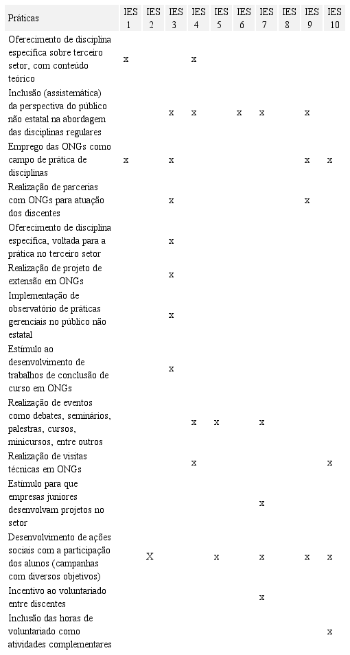 As células em branco retratam lacunas, ou seja, revelam ações favoráveis à formação para o terceiro setor não realizadas. As práticas a seguir foram elencadas nas entrevistas, pelos pesquisadores, mas não são conduzidas por nenhuma instituição: emprego das ONGs como lócus para a realização de projetos de iniciação científica, estímulo ao desenvolvimento de estágios no terceiro setor, estruturação de grupo de pesquisa sobre o tema, capacitação dos professores sobre os desafios do público não estatal e oferecimento de cursos de pós-graduação voltados ao campo.