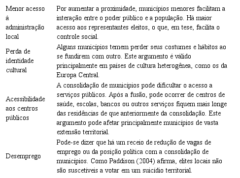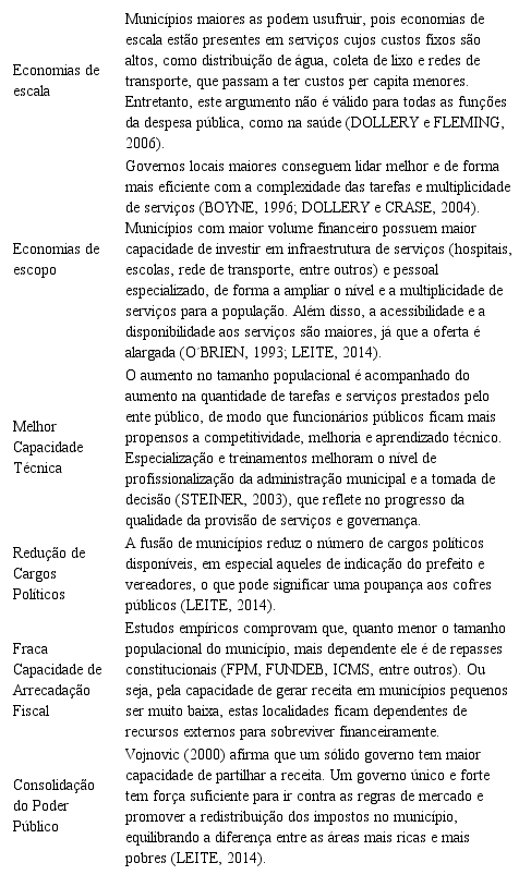 Embora a legislação vá de encontro com a emancipação de municípios, um movimento para a fusão no Brasil ainda não possui força, como em alguns países europeus. Entretanto, para este tema ser debatido de forma concisa, é preciso entender os argumentos a favor e contra esta consolidação territorial. Nos quadros 1 e 2 são apresentados os principais argumentos sobre o assunto. Em suma, as fusões possuem o objetivo de aumentar a eficiência dos governos locais por meio das vantagens da economia de escala e de escopo, da introdução de pessoal com conhecimento técnico nos quadros administrativos, da melhoria da equidade na prestação de serviços através do planejamento profissional (KJELLBER, 1995; BOYNE, 1996), da redução administrativa e diminuição nos custos de conformidade (DOLLERY et al, 2007). Este custo de conformidade é o tempo ou dinheiro gastos para cumprir as exigências do governo, como uma legislação ou regulamentação.