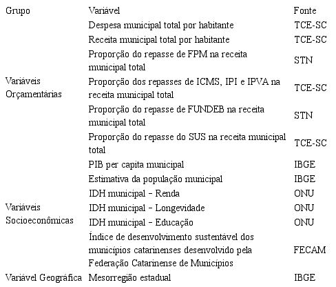 As variáveis orçamentárias visam definir o perfil das contas dos municípios, além de representarem a maior parte da receita de muitos municípios pequenos e de médio porte. As variáveis socioeconômicas auxiliam a interpretar a riqueza municipal média, bem como o bem-estar social existente. Deste modo, foram coletados dados do IDH Municipal (IDHM) da Organização das Nações Unidas – ONU e o índice elaborado pela Federação Catarinense de Municípios (FECAM, 2016). Por fim, a variável geográfica pretende explicar se a região que um município se encontra tem influência no comportamento da despesa per capita.