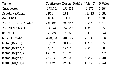 A um nível de significância de 5%, as variáveis explicativas Receita.PerCapita, Peso.FPM, Peso.Impostos TRANS, Peso.SUS TRANS, IDHMEduc, Indice.FECAM e Região, se mostraram estatisticamente significantes. O valor de AIC, que serve para medir e comparar ajuste de modelos, foi equivalente a 3.736,9, o que foi o menor (e, portanto, o melhor) valor encontrado por todas combinações de variáveis, funções de ligação etc.