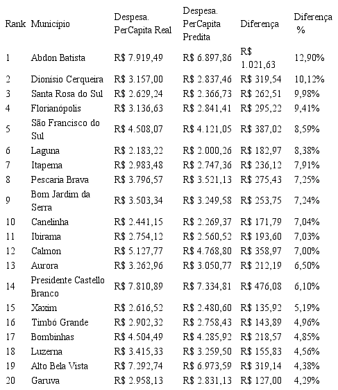 Os municípios apresentaram despesa per capita real acima do que é previsto pelo modelo de regressão. Nenhuma variável inserida no modelo conseguiu explicar a elevada despesa per capita destes municípios em relação ao previsto. Entretanto, ressalta-se que se está lidando apenas com o aspecto econômico da despesa. Um município apresentar despesa per capita mais alta que a estimada não necessariamente aponta possíveis irregularidades nos gastos daquele município, apenas indica que, de acordo com as suas características, e levando em conta a realidade do estado de Santa Catarina, o município tem uma despesa per capita acima do que a estimada pelo modelo.