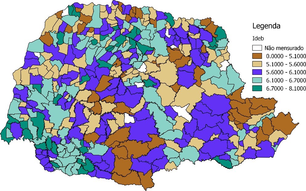 O QGis é um software livre e open source, multiplataforma de sistema de informação geográfica que permite a visualização, edição e análise de dados georreferenciados. Desta forma, como o objetivo de se ter uma melhor representação dos dados, utilizando- se das coordenadas vetoriais disponíveis pelo Instituto Brasileiro de Geografia (IBGE, 2018) para o Estado do Paraná, foi desenvolvidos mapas georreferenciados de desempenho dos munícipios analisados.