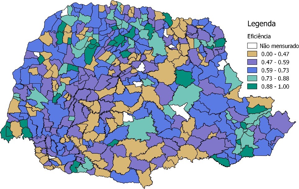 Na análise das eficiências total, técnica e de escala, não se percebeu fortes indícios de problemas quanto à eficiência de escala, visto que a mesma possui uma média alta, ou seja, uma eficiência de cerca de 92%, bem como um baixo desvio padrão. Com a eficiência total (ETccr) e o produto da eficiência de escala (EE) pela eficiência técnica (ETbcc), pode-se concluir que o principal problema dos municípios está ligado à eficiência técnica, pois a mesma apresenta uma média de cerca de 61% e um alto desvio padrão. Entre os municípios eficientes, ou seja, com um índice de eficiência técnica com retornos variáveis de escala de 100%, destacam-se: Tunas do Paraná; Sarandi; Tijucas do Sul; Telêmaco Borba; Fazenda Rio Grande; Paiçandu; Carlópolis; São Tomé; Cianorte; Japurá; Sertaneja; Atalaia; e Serranópolis do Iguaçu. Essa informação coincide com os trabalhos de Silva et al. (2012), Savian e Bezerra (2013), Diel et al.-2014, Dantas, Costa e Silva (2015), Silva et al. (2015), Lourenço et al. (2017), Monte e Leopoldino (2017), que afirmam que poucos municípios se mostraram eficientes.