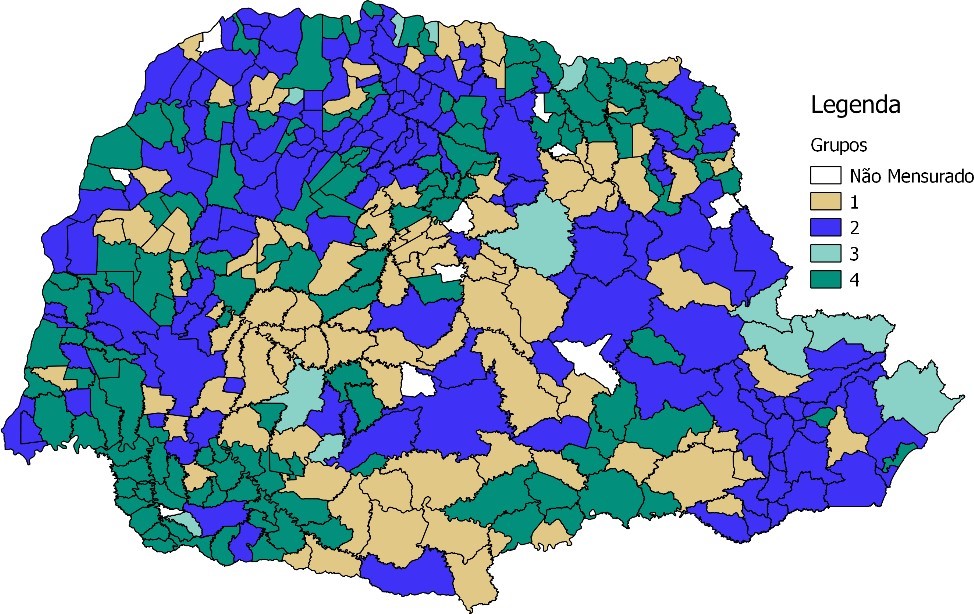 Quanto ao número de grupos, visto que o interesse foi em identificar perfis que pudessem desenvolver análises e estratégias de ações, acredita-se que algo entre dois a seis agregados seja o adequado. Para uma seleção mais acurada, utilizou-se do coeficiente de aglomeração, o qual é utilizado para uso em uma regra de parada e tem se apresentado como um algoritmo preciso, como indica Hair (2009). Ao final, foram encontrados quatro agrupamentos: o grupo 01, que agrupou 97 municípios; o segundo grupo, com 142; terceiro grupo, 12; e o quarto grupo, 138.